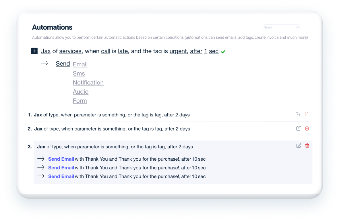 המערכת החכמה שלנו מאפשרת יצירת אוטומציות במגוון רחב מאוד של תחומים. במקום לשרוף זמן יקר בחזרתיות על פעולות טכניות ויומיומיות תוכל להתרכז בניהול יעיל ונכון יותר עבורך- תזכורות מתוזמנות לעובדים ולקוחות, שליחת מייל משוב לאחר התקשרות, הפניית מסמכים ליעדים נבחרים ועוד הרבה יותר. הלקוח תמיד ירגיש במרכז ואתה תוכל להמשיך ולקדם את העמותה ליעדים הבאים.