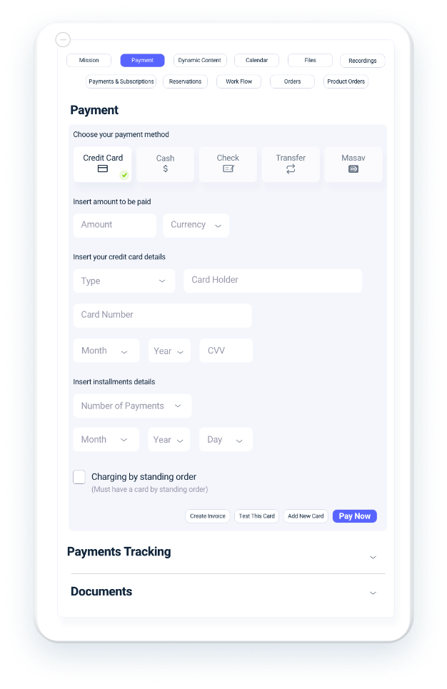 ניהול מערכת התשלומים שלך באופן אינטואיטיבי ופשוט. מערכת מאובטחת לחלוטין מקצה לקצה, המאפשרת ללקוח תשלום חכם ומהיר ולך בעל העסק מוקד אחד המכיל את כלל מערך התשלומים- קבלות, חשבוניות ועוד.